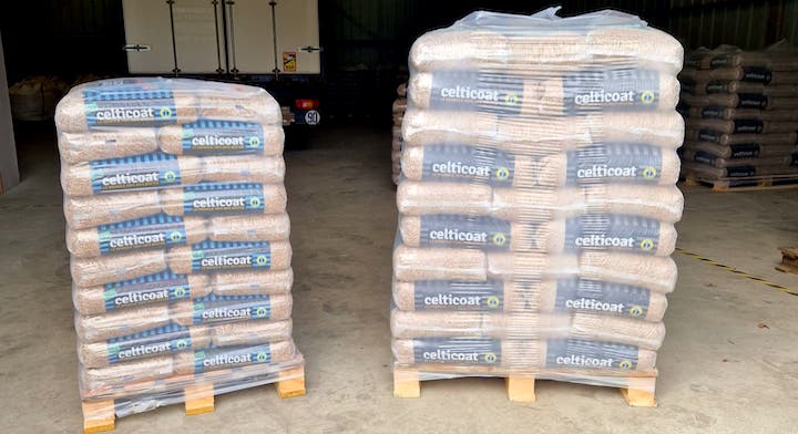 Palette de sacs de 10 kg de pellets Celticoat à côté d’une de sacs de 15 kg, plus facile à ranger dans l’habitation, photo Le Comptoir à Granulés à Plescop dans le Morbihan