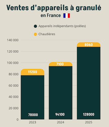 • 128 000 poêles à granulé vendus en 2025, soit +36 % par rapport à 2024